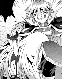![]() Lina empieza descubrir la clave de todo lo que ocurre, pero antes de comprobarlo llega Lyos con la Banisher, asestando un golpe a Flummeze que destroza la mitad de la cabeza del mazoku. Mientras éste grita de dolor, Lina comienza a conjurar el Drag Slave, lo que sorprende a Ameria pues pensaba que la magia negra no se podía utilizar allí. Lina lo lanza cogiendo entre sus manos un trozo del Colmillo del Rey Demonio, consiguiendo que el conjuro tenga efecto y destruyendo por completo a Flumeeze, aunque el pedazo del colmillo queda destruído. Lina explica que Flumeeze le había dicho que era más fácil usar su poder cerca de Lina, y los monstruos siempre aparecían a su alrededor, así que supone que el colmillo es un acceso al poder de los mazoku. Lina decide que si los mazoku quieren jugar con ella, jugará, pero para ganar. 10. ¡¿En busca del "Poder Divino"?!