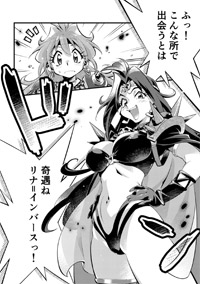 su auténtica discípula. Tras conocer a Naga, le pidió que le enseñara como lo haría Lina Inverse.Lina se niega a aceptarla como discípula, por lo que Ryuna la reta a un duelo para mostrarle su poder. Durante la batalla, Naga interviene, pero paraliza a Ryuna con un hechizo de hielo por accidente. Lina y Naga comienza a pelear hasta que aparecen varios trols, atraídos por el ruido. Lina libera a Ryuna y las tres hechiceras derrotan a los trols. Aun así, Lina no acepta a Ryuna como discípula, y le anima a buscar su propio camino en vez de desear ser como otra persona. Relato extraído del libro conmemorativo oficial "Sakura Collaboration" de la
